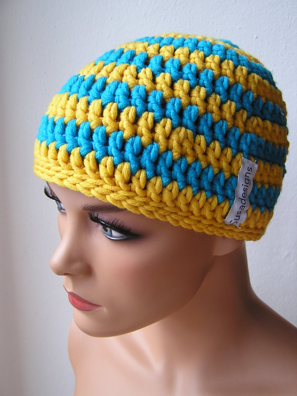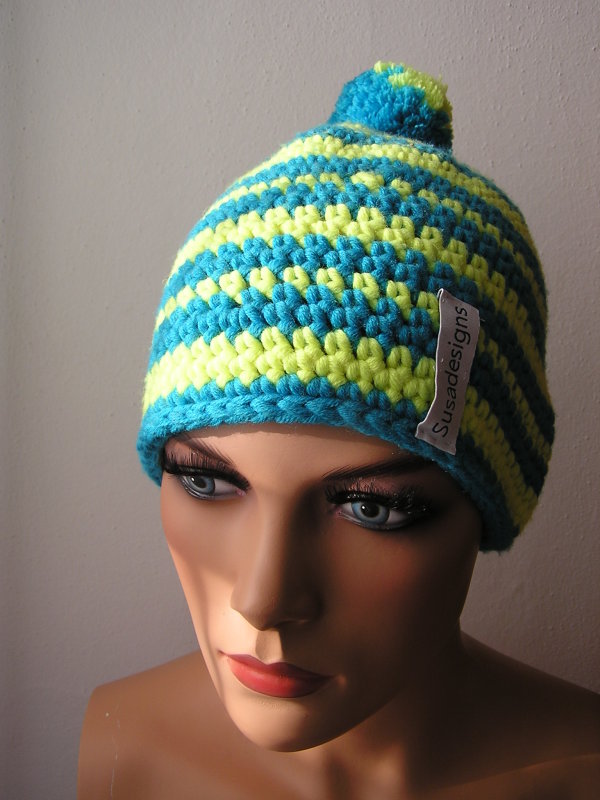 Häkelmütze Türkis/Neongelb, Einheitsgröße Medium