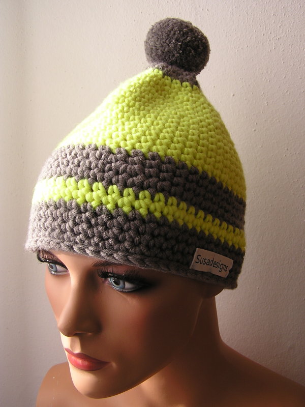 Häkelmütze Grau/Neongelb, Einheitsgröße Medium