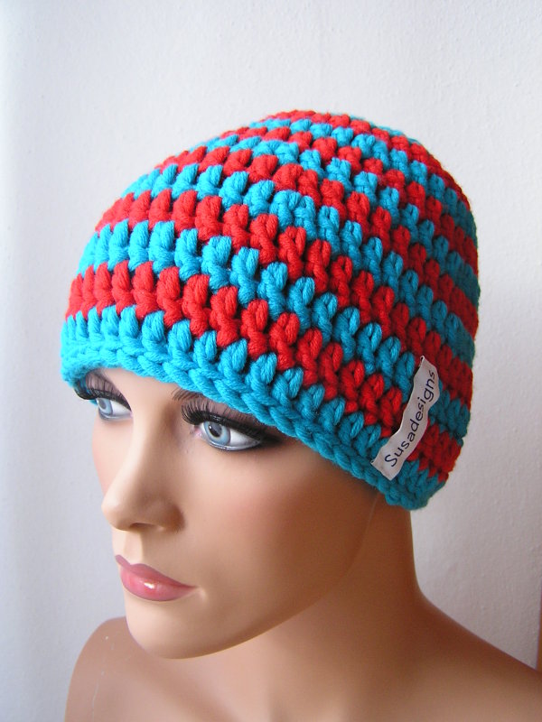 Häkelmütze Sommer Türkis/Rot, Einheitsgröße Medium Groß