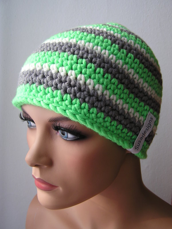 Häkelmütze Hellgrün/Grau/Weiss, Einheitsgröße Medium