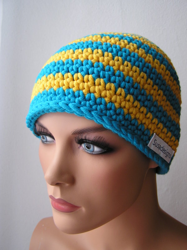Häkelmütze Sommer Türkis/Gold, Einheitsgröße Medium Klein